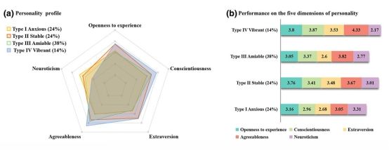 图1. (a) 人格剖面 ( b) 各剖面在五个人格维度上的表现