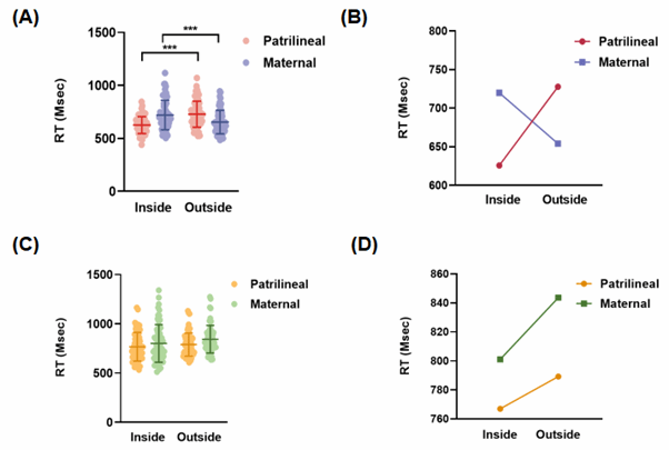 图1. 实验一反应时结果。(A)中文亲属词判断任务的反应时。(B)中文亲属词判断任务中辈分与位置的交互效应。(C)英文亲属词判断任务的反应时。(D)英文亲属词判断任务中辈分与位置无交互效应。