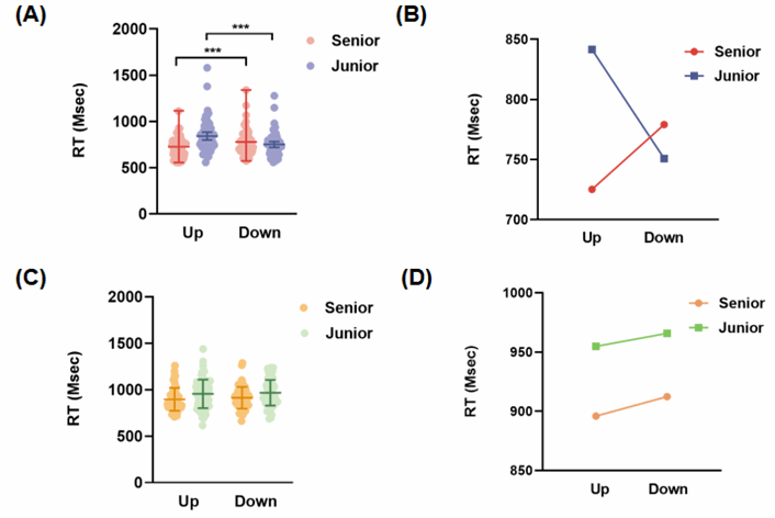 此外,研究在高低水平英语学习者之间发现了显著的四因素交互作用。在中文任务中,高水平英语学习者对晚辈词的“下方一致性效应”显著弱于低水平组,而长辈词的“上方隐喻”并未因英语水平提升而受到影响。