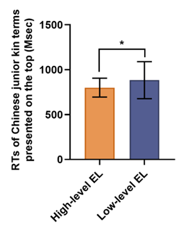 图3. 高,低英语水平学习者在中文亲属词判断任务中“晚辈-上”的反应时对比。