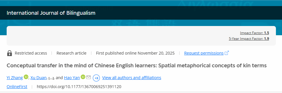 燕浩教授团队使用眼动追踪手段,在国际知名期刊International Journal of Bilingualism上,在线发表了题为“Conceptual Transfer in the Mind of Chinese English Learners: Spatial Metaphorical Concepts of Kin Terms” 的语言认知研究成果。